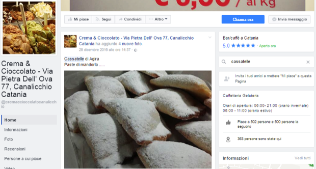 Situata in via Pietra dell’Ova 77 e affiliata alla catena Crema e Cioccolato, l’abbiamo scovata un giorno che avevamo impellenza di trovare delle Cassatelle di Agira nel capoluogo etneo: digitando su un motore di ricerca, tolti siti generici e qualche produzione industriale cittadina, il primo risultato utile era proprio quello di questa pasticceria.