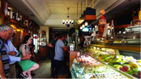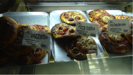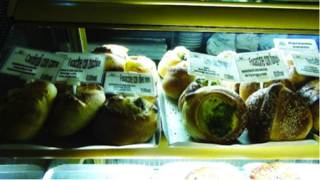 Ci vuole almeno una buona mezz’ora soltanto per soddisfare la vista con l’infinita varietà di cose buone che si affacciano dai banconi. Ti ritrovi a camminare avanti e indietro da un estremo all’altro del locale, facendo la spola tra gli espositori dei dolci e quelli dei prodotti salati.