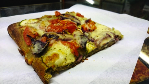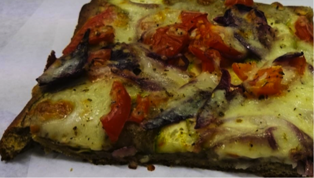 La particolare consistenza dell’impasto è esaltata dal condimento: giusta la scelta di non mettere la salsa, bensì di usare l’acidità del pomodoro crudo, sposandola con verdure e formaggio fuso. Una delle pizze più buone e singolari che si possano provare in Italia.