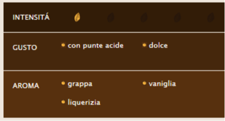 Se nel caso del Rosso l’aromatizzazione è quella calda al caffè, in questo Bianco invece si tratta della grappa, quindi i sentori sono più acidi e fruttati.