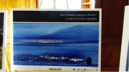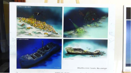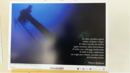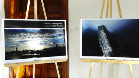 In esposizione, foto di relitti che ancora giacciono a più di settanta metri di profondità nelle acque che bagnano la Sicilia.