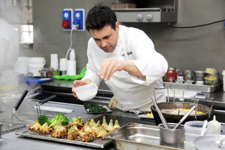 Aperitivo con sandwich caldi e freddi; Vellutata di crescione, gamberetti di laguna croccanti; Granseola all’olio dolce di mandorla trama di zucchine, miso di crostacei; Risotto a colori, frutti dell’Adriatico; Asparagi, mandorle e agrumi; Agnellino da latte al forno, fave, nocciole e piselli; Gnummareddi alla salvia, olive verdi ed albicocche; Sgroppino allo zenzero e aji charapita; Uovo all’uovo, ricotta e fragoline di bosco; Caffe ca’ cuccumella.
