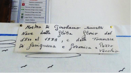 Un’esposizione a dir poco eccentrica, fin dal titolo, scritto a mano, il quale recitava: “mostra di Girolamo Savalli, nave della flotta Florio dal 1900 al 1939 e delle tonnare di Favignana e Formica e pozzo Vecchio”…