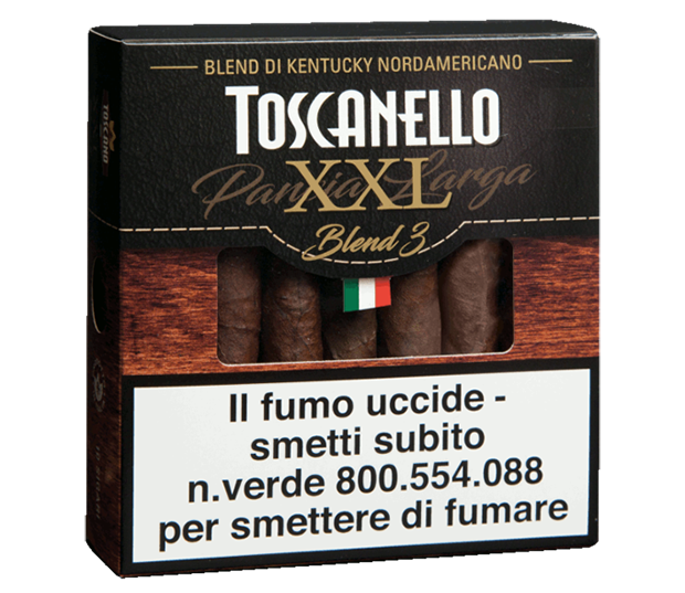 E’ un rigoroso omaggio al gusto statunitense il nuovo Toscanello XXL Blend 3, ammezzato a pancia larga composto interamente da tabacco nord americano, un assemblaggio “accolto da una fascia scura e dai sentori tipicamente affumicati”.
