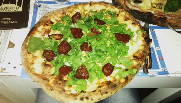 Che sia questo il vero motivo del successo del locale lo abbiamo verificato dalla vox populi: chiunque parli del locale Al Vicolo dice “quello che fa le pizze enormi”, quasi omettendo qualunque altro elemento di informazione.