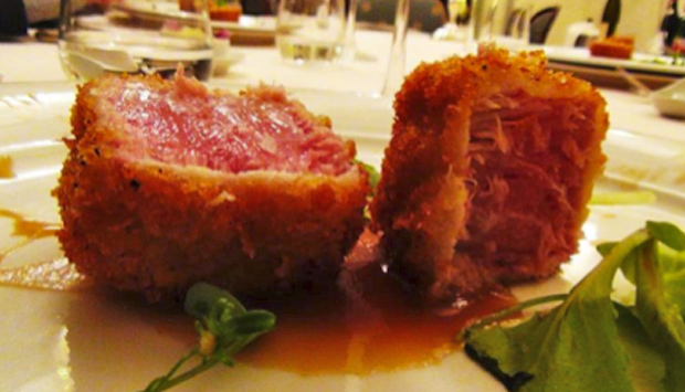 Arriva un pacchero fritto che echeggia la pasta al forno alla napoletana, concentrandone al suo interno tutti gli ingredienti canonici: sfizioso, da mangiare in un sol boccone.