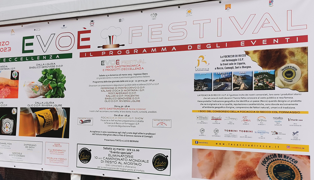 Show cooking degli chef dei ristoranti del territorio, presentazioni delle più ricercate IGP e DOP, mercatino con le più rare eccellenze certificate della zona, il campionato del pesto fatto come una volta, generose degustazioni della strepitosa focaccia di Recco col formaggio, presenze istituzionali, star tv e tante storie emozionanti del quotidiano, tutto tenuto mirabilmente insieme da un’organizzazione perfetta straripante di competenza, attenzioni e umanità: già alla prima edizione si staglia come modello virtuoso per il Paese intero nel panorama della promozione turistica e della divulgazione enogastronomica l’Evoè Festival – Arte gastronomica e prodotti d’eccellenza che si è svolto a fine marzo a Recco, deliziosa località in provincia di Genova ricca di valori come la resilienza, l’impegno e l’affettuosa ospitalità.