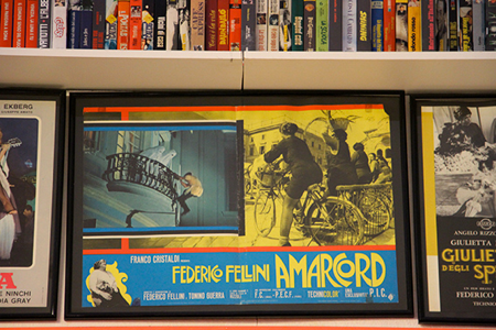 Una libreria ricopriva un’intera parete, dal pavimento al soffitto, esponendo saggi, biografie, sceneggiature, videocassette, dvd e tutto ciò che si può immaginare relativamente al contesto cinematografico.
