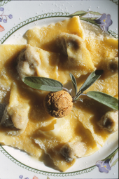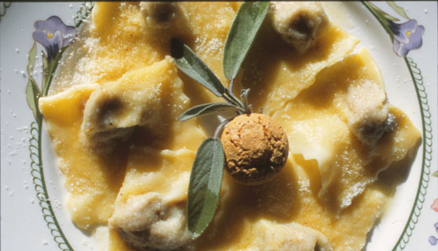 Dopo aver confezionato i ravioli, cuocerli in acqua salata per 5 minuti e scolare. Condire con parmigiano e burro fuso aromatizzato con salvia e aglio.