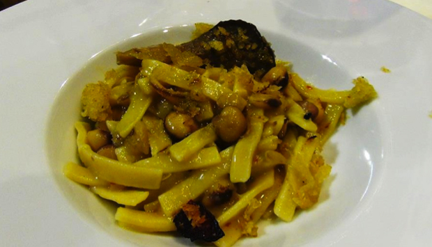 Dalla Tenuta Pinto di Mola di Bari propongono una ricetta territoriale che ha il pregio di riunire prodotti tipici della zona: Laganari con Cicerchie, funghi Cardoncelli, Sponzali (“cipolle fresche senza bulbo, si coltivavano appositamente per queste ricette, oggi si usano anche normalmente come cipolla fresca”), mollica fritta (di pane di Altamura) e Diavolicchio dolce (varietà di piccoli peperoni).