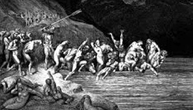 Nell’Inferno anche i diversi aspetti che caratterizzano il mondo gastronomico rientrano nelle pene; in un certo senso l’atto del cucinare diventa veicolo di somministrazione della pena ai dannati. Nella quinta bolgia i barattieri, speculatori fraudolenti di cose e cariche pubbliche a fini di lucro personale vengono tenuti sotto la pece bollente. “Non altrimenti i cuoci a lor vassalli” e continua “… fanno attuffare in mezzo la caldaia, la carne con li uncin, perché non galli …” (XXI, 55-57). Questa scena delinea bene l’immagine dell’inferno come una grande cucina dove i diavoli, mostruosi cuochi, ordinano ai loro sguatteri di immergere bene la carne dei dannati affinché non affiori e cuocia perfettamente. Scene simili sono descritte in altri punti: i violenti verso il prossimo nella persona e negli averi, per esempio, vengono definiti “bolliti” perché cotti nel sangue.