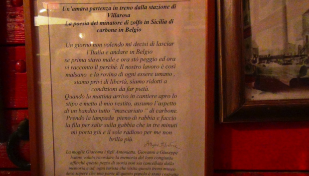 Non soltanto raffinati letterati, ma anche minatori dalla vita durissima possono esprimere poesia. Ne è dimostrazione il componimento che campeggia tra le esposizioni del Treno Museo di Villarosa in provincia di Enna. La poesia del minatore di zolfo in Sicilia e di carbone in Belgio è stata scritta da un emigrante che così ha raccontato la propria dura esperienza di una vita trascorsa da una miniera all’altra, lungo i confini estremi dell’Europa.