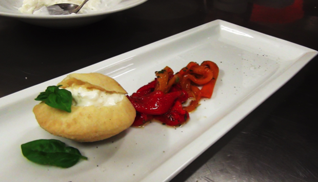 Farcire con: paté di acciughe, stracciatella di burrata, 1 fogliolina di basilico.
