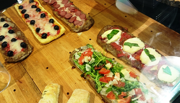 I prodotti da forno la fanno da padrona, a partire dalle pizze alla pala che occhieggiano di fronte l’ingresso con parete a giorno: gli impasti di colore più scuro annunciano la presenza di molteplici cereali che si presentano al palato con una spiazzante consistenza morbidissima, quasi cremosa, attirando tutta l’attenzione e distogliendola dai condimenti.