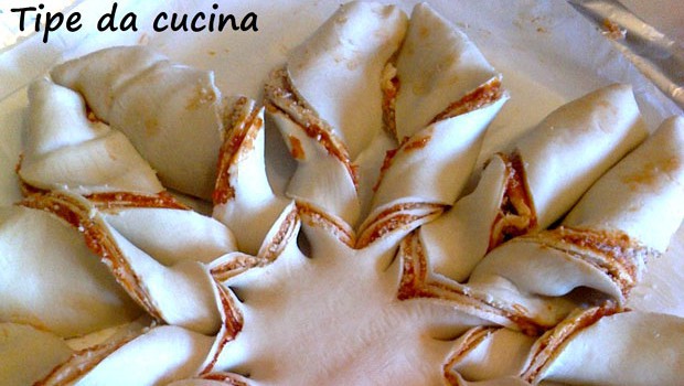 Occorrono tre dischi di pasta sfoglia pronta che abbiamo sovrapposto dopo avere cosparso i primi due di passata di pomodoro, grana, origano e un filo d’olio. Pratichiamo otto tagli a raggera (in modo da formare sedici “petali”), assicurandoci di tralasciare la parte centrale. Afferriamo delicatamente due “petali” alla volta roteandoli verso l’interno per due volte.