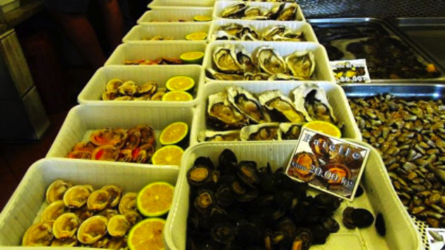 Al suo interno, in alcune piccole vasche, si agitano ancora vivi i frutti di mare tipici del territorio: vongole, fasolari, cozze, telline. Talmente freschi che ti spruzzano l’acqua addosso mentre gli giri intorno.