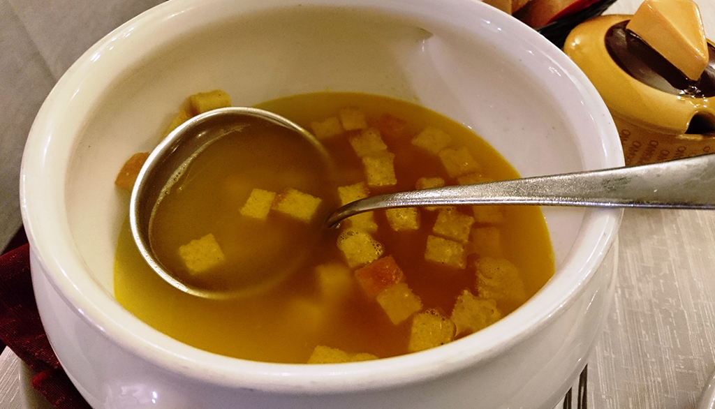 Ed ecco arrivare un grande classico purtroppo quasi dimenticato dalla Cucina Petroniana, ovvero un piatto simbolo della tradizione culinaria di Bologna certificata e documentata, ma sempre meno praticata: è la Zuppa Imperiale, commovente sontuoso brodo che esplode di sapore, grazie alla presenza di cubetti composti da un impasto di semolino, uova, parmigiano, noce moscata e burro, anche se storicamente si registrano delle variazioni come l’impiego della farina che sostituita al semolino fornisce una consistenza diversamente spumosa, mentre nell’interpretazione delle suore del millenario eremo di Gamogna sull’Appennino tosco-romagnolo che rientra nel comune di Marradi all’interno della diocesi di Faenza-Modigliana si usa il pane raffermo nell’ottica della cucina del riciclo.