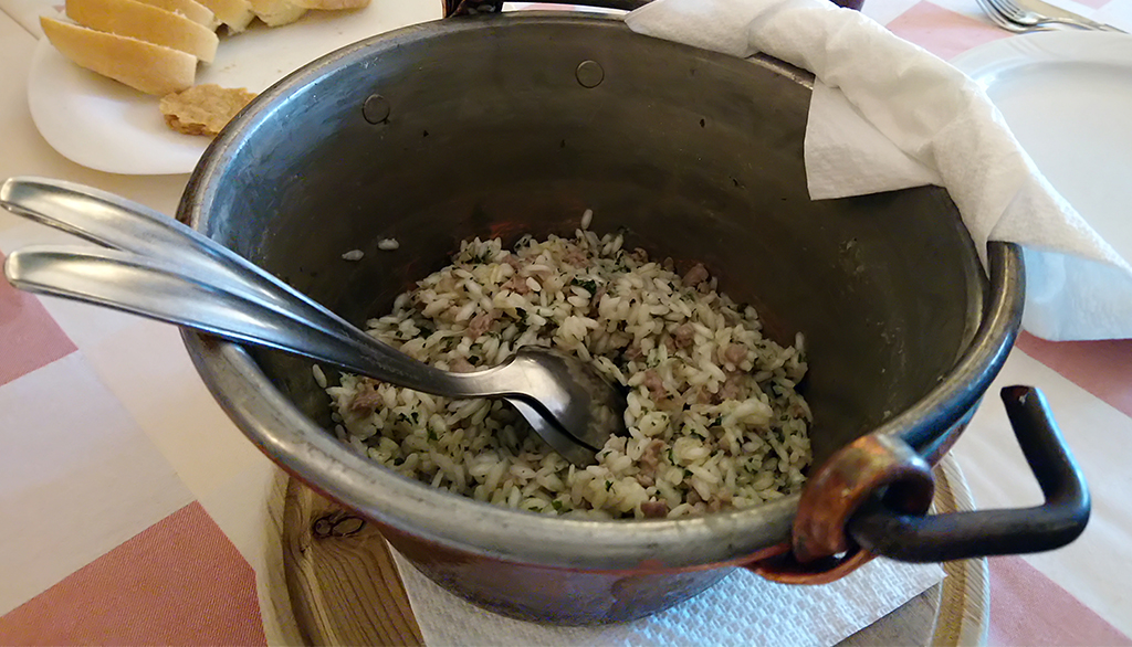 … e di eguale enorme impatto emotivo è il Riso nel Parol, Carnaroli cotto e servito nel paiolo, condito con pasta di salame, grana, olio extravergine e prezzemolo, sublime nella sua complessità…