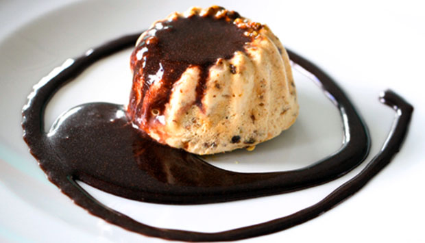- Foderate il fondo degli stampini con la granella rimasta, riempiteli con l’impasto e metteteli in freezer per tre ore. Una volta freddo capovolgete lo stampino sul piatto e decorate con una salsa di cioccolato fondente ottenuta facendo sciolgliere a bagnomaria una tavoletta.