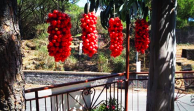 “Una delle produzioni più caratteristiche dell’area del Vesuvio sono i pomodorini da serbo col pizzo, detti anche spongilli o piénnoli (pendoli) per l’abitudine di appenderli alle pareti o ai soffitti, riuniti in grappoli (schiocche) e legati con cordicelle di canapa”: è affascinante l’incipit con cui Slow Food introduce uno dei prodotti più straordinari del nostro Paese, il Pomodorino del Piennolo del Vesuvio.