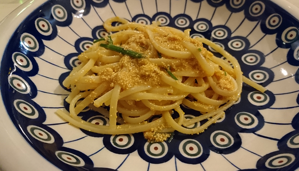 Le linguine del pastificio Leonessa di Napoli condite con insolite delicatissime uova di carpa rappresentano un piatto tanto originale quanto suadente, autentico capolavoro.