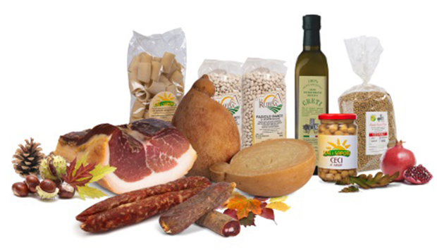 Una “terra di vento, di freddo e di neve” con “terreni incontaminati e ricchi di sorgenti, pascoli, seminativi, oliveti, vigneti e boschi” da cui “originano salumi, legumi, oli, formaggi, dolci e conserve genuini, dal sapore inconfondibile, gustoso e naturale, ottenuti con tecniche di coltivazione e lavorazioni artigianali tramandate amorevolmente di padre in figlio”.