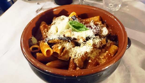 Al di là degli aspetti filologici, la Pasta a Taianu del locale è una pietanza sontuosa, una delle più buone mai mangiate. Affascina che venga servita nel coccio, sorprende la sua ricchezza debordante che ne fa un piatto unico, tanto sazia e appaga: i tortiglioni sono cotti al dente, il sugo è golosissimo, la carne eccellente per consistenza e sapore, le melanzane perfette e la ricotta salata un tocco che rende ancora più ghiotto il tutto. Un piatto strepitoso che vale il viaggio e va provato almeno una volta nella vita.